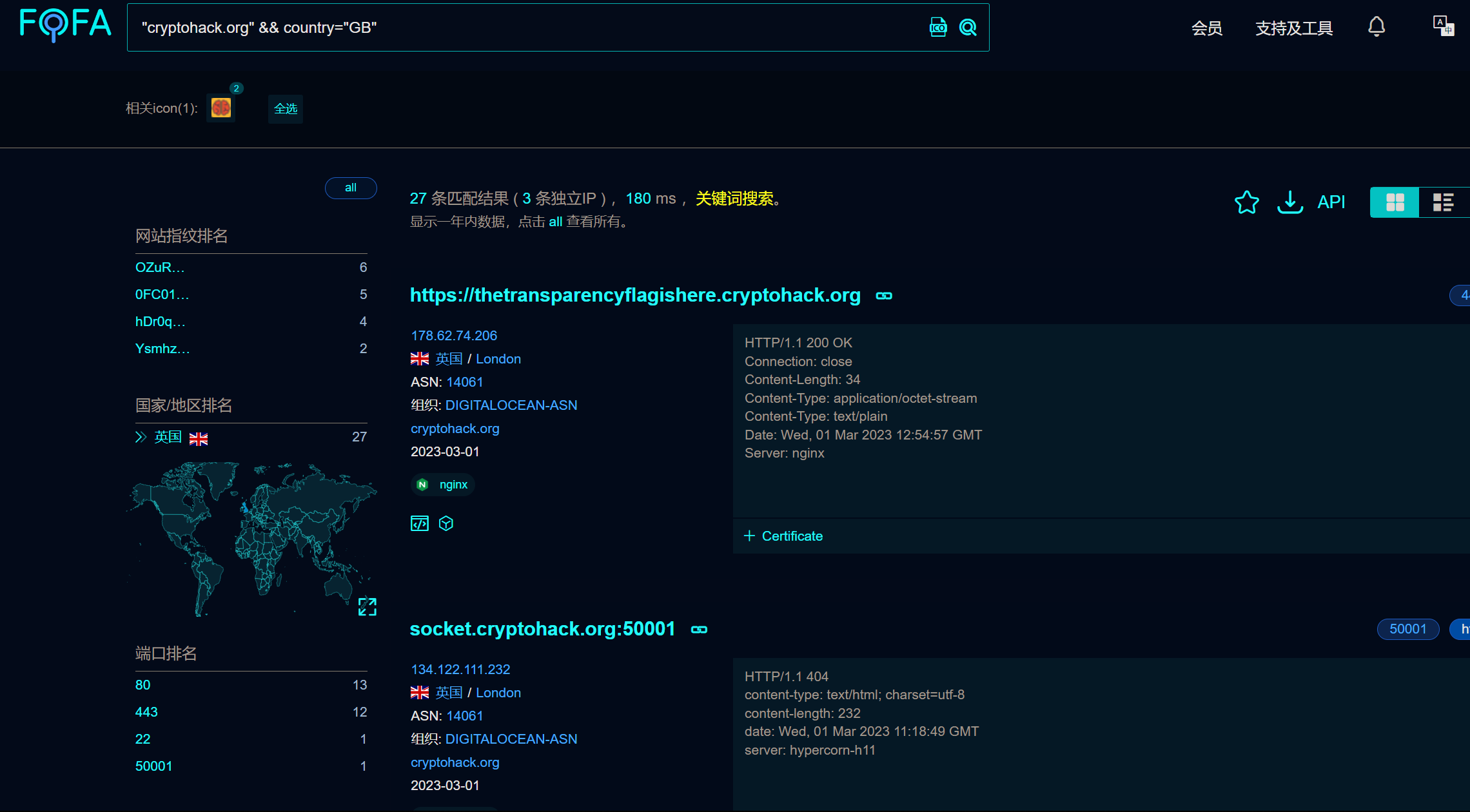 即可 国籍是因为看到查到的来自于 *.cryptohack.org 的域名均为英国 于是加上国籍属性后,检索结果的第二页即可看到