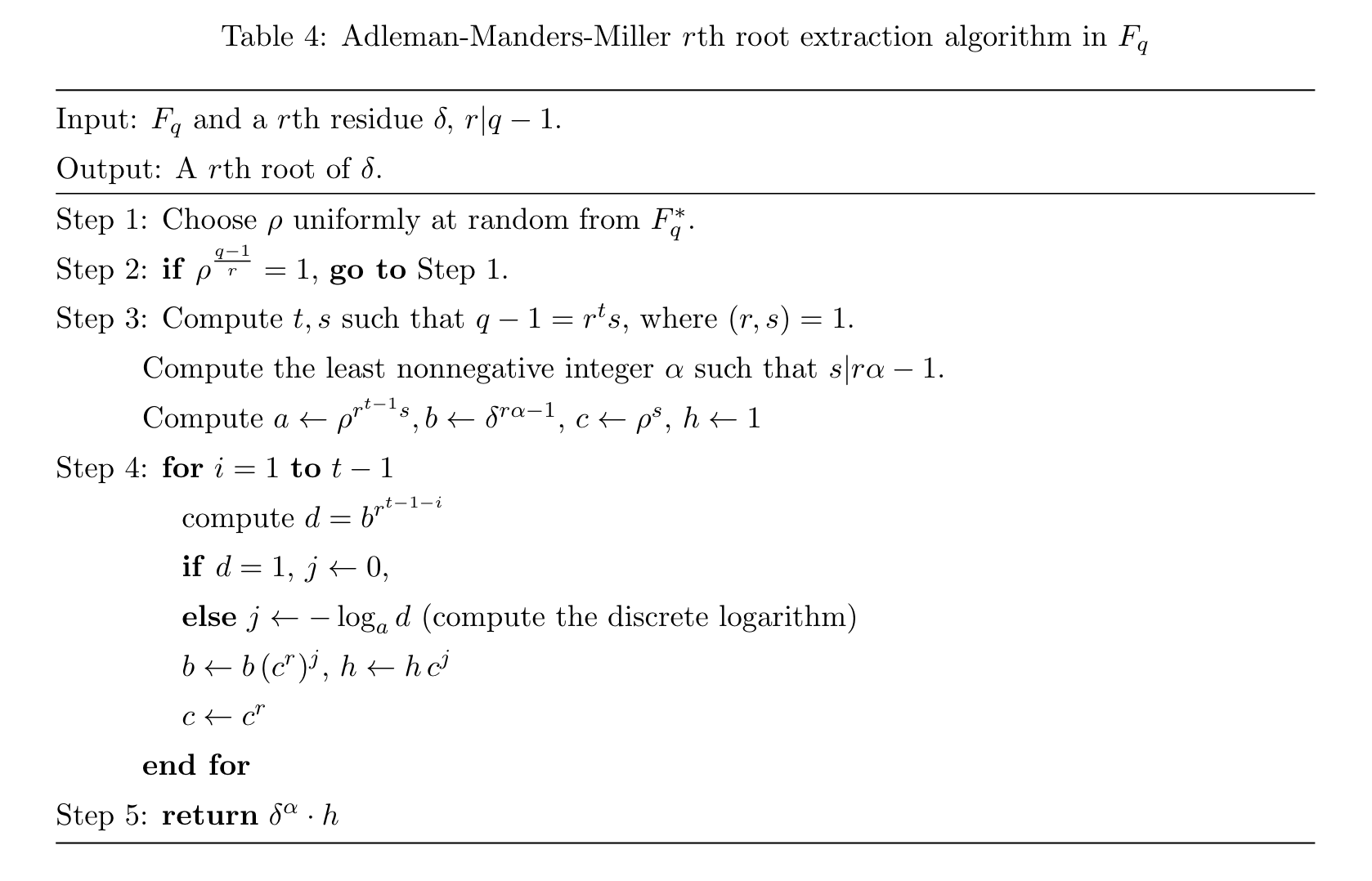要计算离散对数 $\log_a d$,使用蛮力搜索需要 $\mathcal{O}(r \log^2 q)$ 的时间。因为最坏情况下有 $t-1$ 个离散对数,所以需要 $\mathcal{O}(tr \log^2 q)$ 的时间。因此,最终的估计是 $\mathcal{O}(\log^4 q + r \log^3 q)$。注意,如果 $r$ 足够大,算法无法在多项式时间内运行。