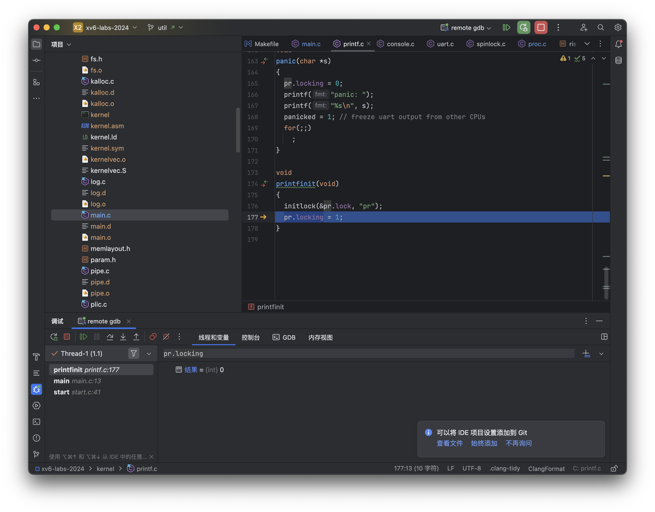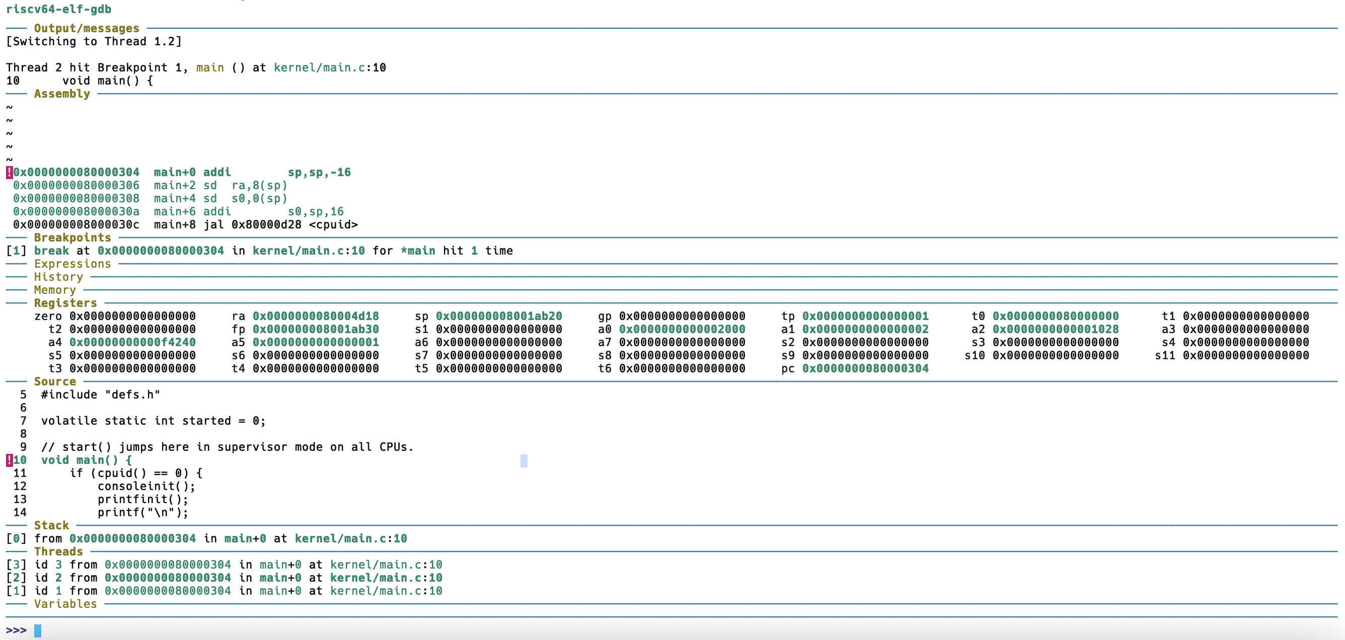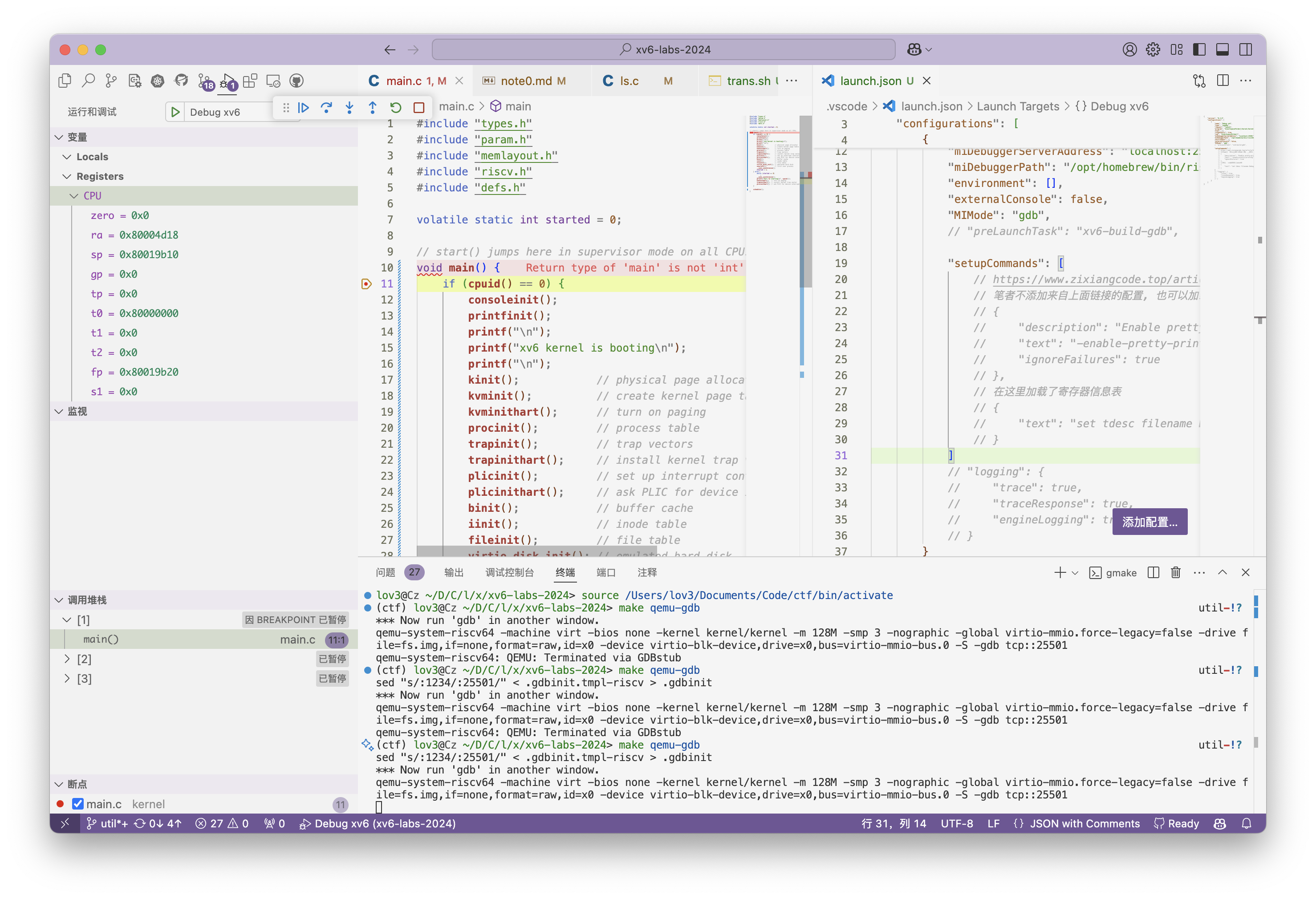但如果想用更方便的 VS Code 进行调试, 参考网上的资料配置后, 按下调试, 终端此前的 make qemu-gdb 会自动退出